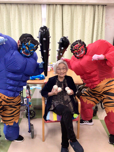 利用者様には、鬼(職員)に向けて豆に見立てたボールを投げ、鬼を追い払って頂きました。 皆様とても良い表情でボールを投げられていました。良い気分転換にもなったと思います。